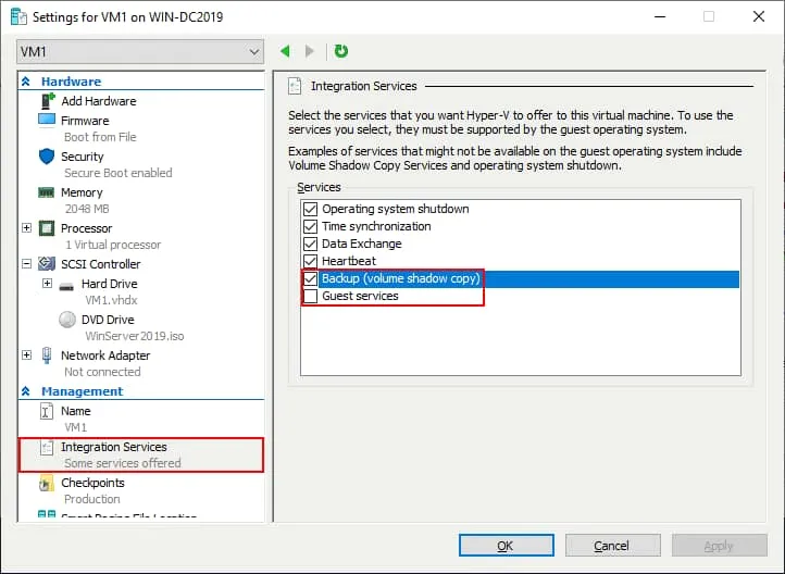- Select/Deselect the Backup (volume checkpoint) option. The deselected option is used for crash-consistent checkpoints, and the selected option is used for application-consistent checkpoints (the VSS signal is passed to a guest OS). If there is an issue with the VSS writer, disabling this option can be of help. Select the Guest Services option.