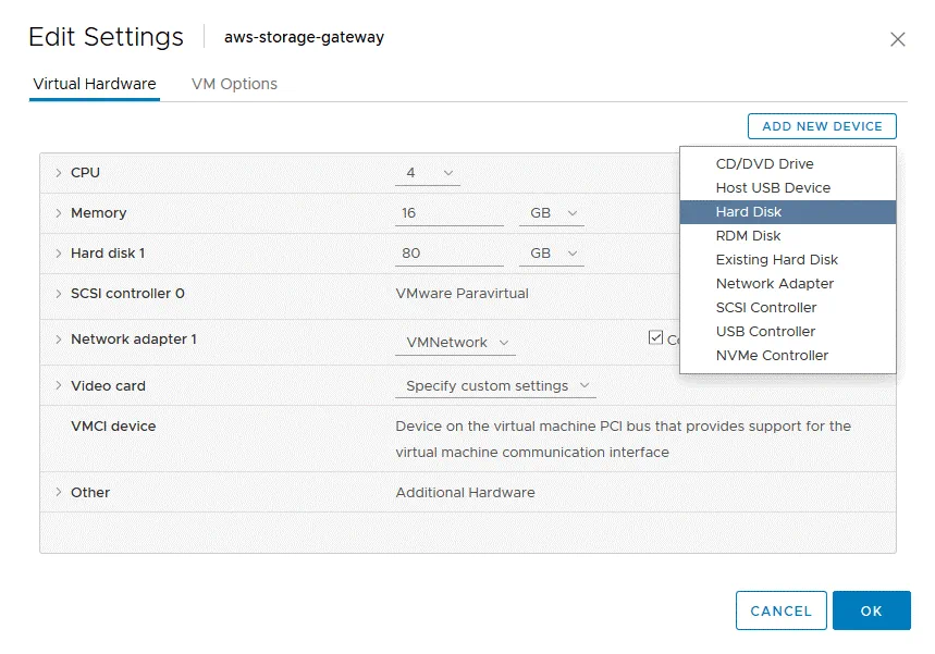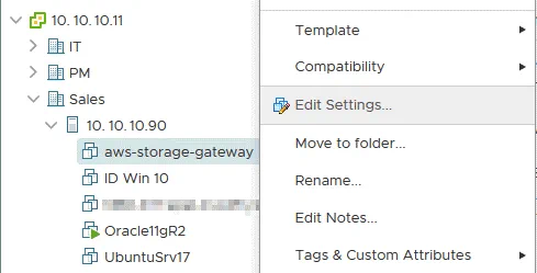 Right click the VM (aws-storage-gateway is the name of the Storage Gateway VM deployed from the template in this example) and in the context menu hit Edit Settings.