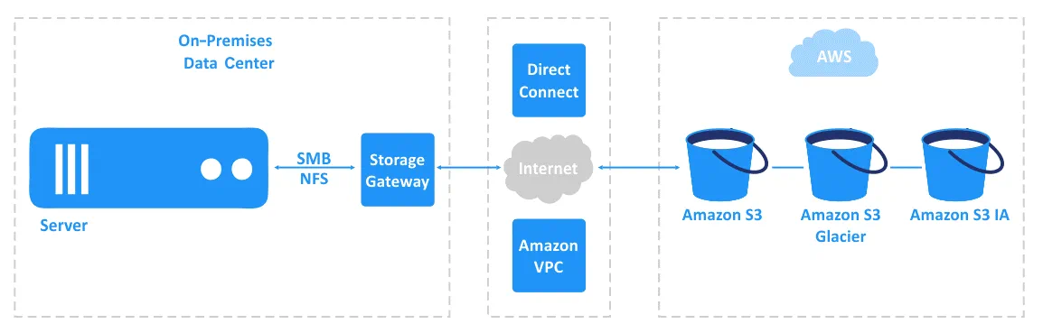 AWS Storage Gateway is a special solution that acts like a bridge between your traditional physical or virtual machines and cloud storage in AWS. It provides seamless integration between on-premises and cloud environments. AWS Storage Gateway provides access to unlimited Amazon S3 storage, Amazon S3 Glacier, Amazon S3 Glacier Deep Archive, and Amazon EBS (Elastic Block Storage). This concept of integrating on-premises storage and cloud storage can also be called hybrid storage. An internet connection is required for Amazon Storage Gateway because a connection to AWS servers must be established.
