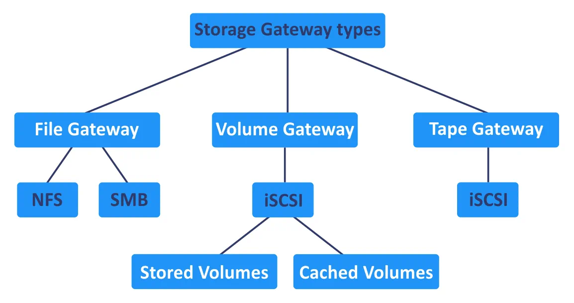 There are three types of AWS Storage Gateway: File Gateway, Volume Gateway and Tape Gateway.