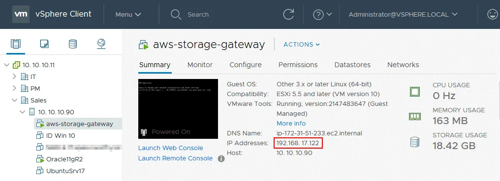 Check the IP address of the Gateway VM (VA). You can find the IP address of the VM in the interface of VMware vSphere Client by selecting the needed virtual machine. In this example, the internal IP address of the AWS Storage Gateway VM is 192.168.17.122.