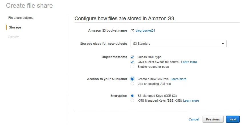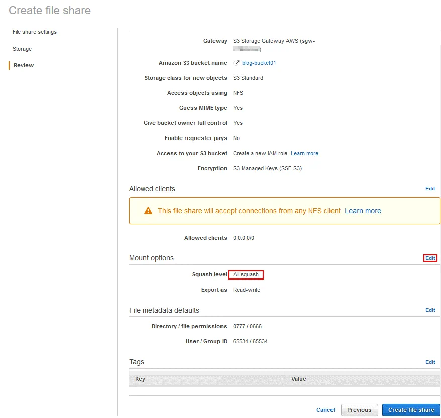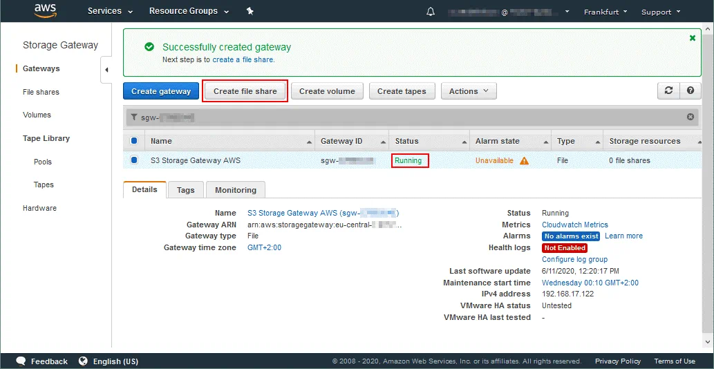 It’s time to create a file share in order to connect to a bucket by using standard NFS or SMB (CIFS) protocols. Let’s configure the connection to an Amazon S3 bucket via NFS.