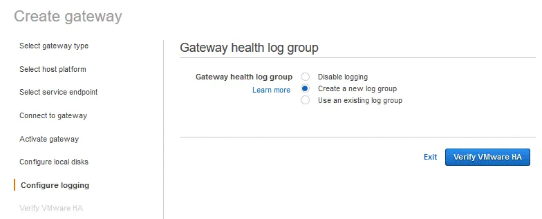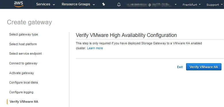 Click Verify VMware HA if your Storage Gateway VM is running in the VMware High Availability cluster. We hit Exit as the Amazon Storage Gateway virtual appliance is not deployed in the VMware HA cluster in our example.