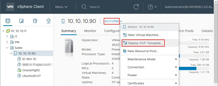 In our example, we select the host with IP address 10.10.10.90. After selecting the ESXi host in VSphere Client, click Actions > Deploy OVF Template.