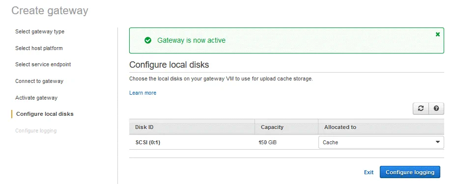 Configure local disks. Ensure that your 150-GB virtual disk is allocated to cache. Then hit Configure logging.