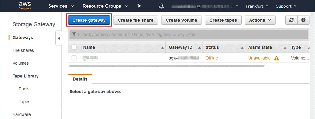 On the Storage Gateway page, click the Create Gateway button in the Gateways section of the navigation pane. On this page you can find previously created storage gateways if they are present.