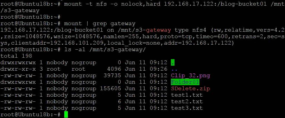 sudo mount -t nfs -o nolock,hard 192.168.17.122:/blog-bucket01 /mnt/s3-gateway