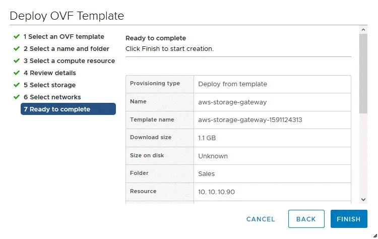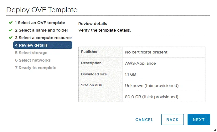 4. Review details. Verify and review the template details of the AWS Storage Gateway virtual appliance you are about to deploy.