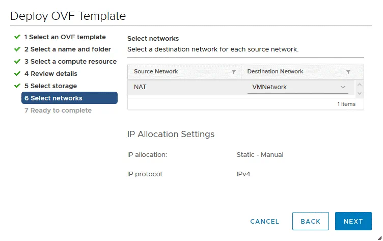 6. Select networks. Select a vSwitch that is connected to a router and provides an internet connection. A virtual network adapter of the virtual machine will be connected to this vSwitch and the appropriate network after deployment.