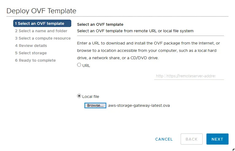 1. Select an OVF template. Select Local file and click Browse to select the downloaded ova file. In this case we select aws-storage-gateway-latest.ova in D:\virtual\. Hit Next at each step of the wizard to continue.