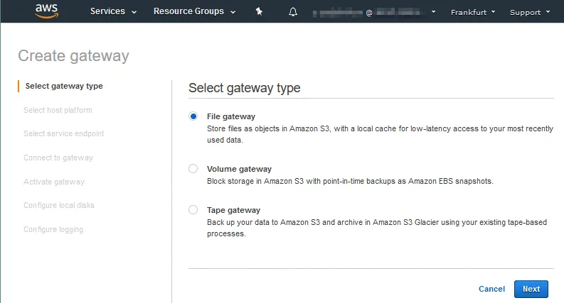 Select gateway type. Select File gateway to store files as objects in Amazon S3. Click Next at each step of the wizard to continue.