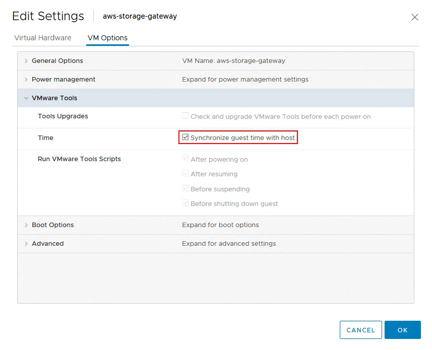 Select your aws-storage-gateway VM in the list of VMs, click Edit Settings. On the Edit Settings screen select the VM Options tab, click VMware Tools to expand settings, and select the “Synchronize guest time with host” checkbox. Hit OK to save settings.
