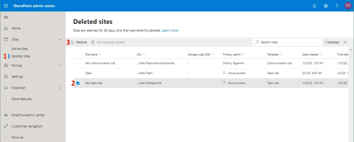 Open the Recover a deleted SharePoint 365 site page by using the link: