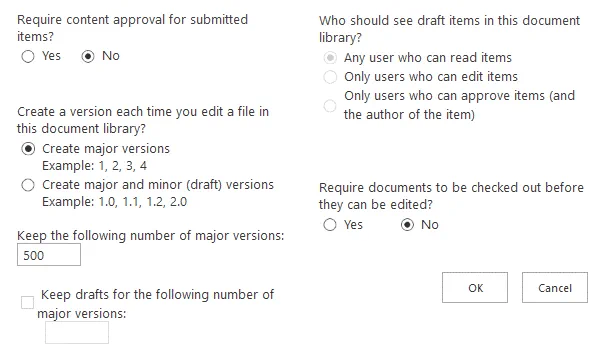 Note, that when versioning is enabled, more storage space is required to save each file version. Office 365 Business and Office 365 Enterprise subscription plans allow you to save up to 500 file versions in SharePoint Online. If you need to save more than 500 versions, you can upgrade your subscription plan.