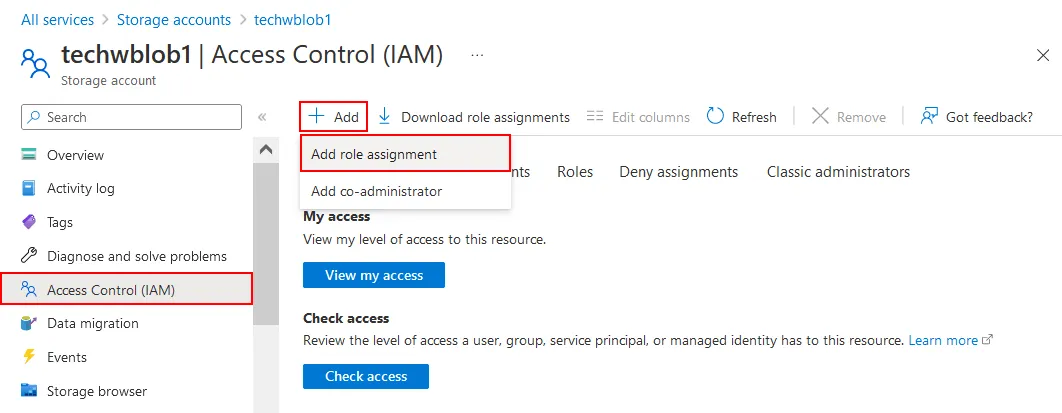 - Click Access control (IAM) in the left pane of the storage account page. Then Click + Add > Add role assignment.