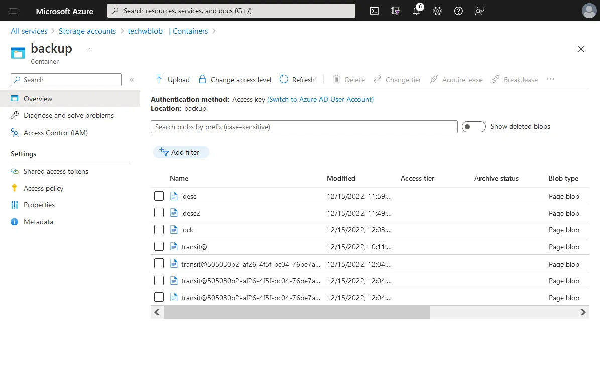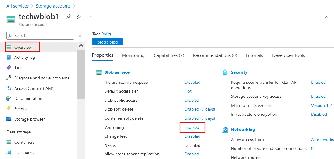 - Go to All Services > Storage accounts, select your storage account (techwblob1 in our example) and click Overview. Ensure that Versioning is enabled before storing backups in Blob containers. In the screenshot below, versioning is enabled and the Enabled link is clickable. If versioning is disabled, click Disabled to edit versioning settings.