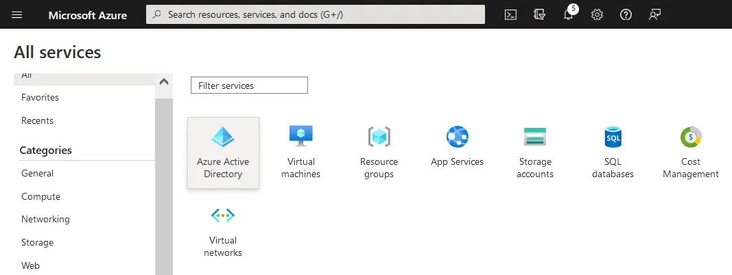 - On the main Azure dashboard of the Azure portal, select All services and click Azure Active Directory.