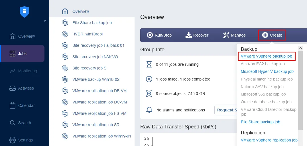 Open the Jobs dashboard and click Create > VMware vSphere backup job.