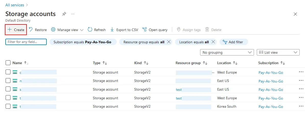 - Click the + Create button on the Storage accounts page.