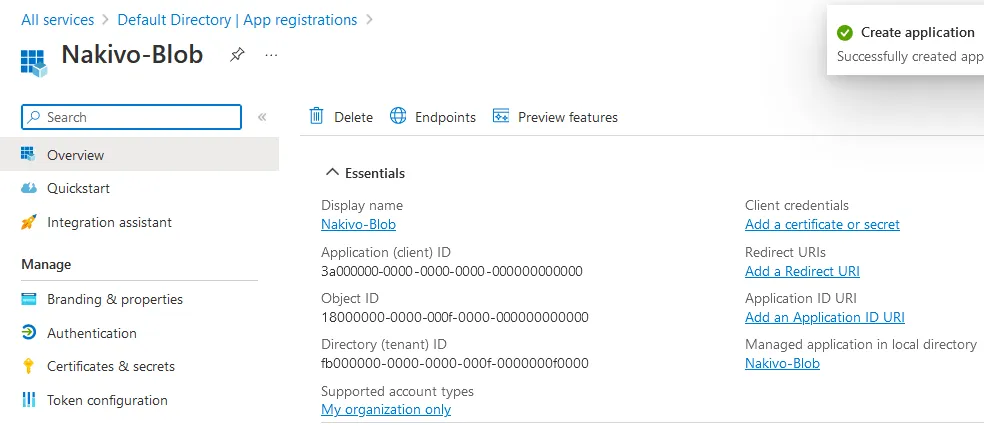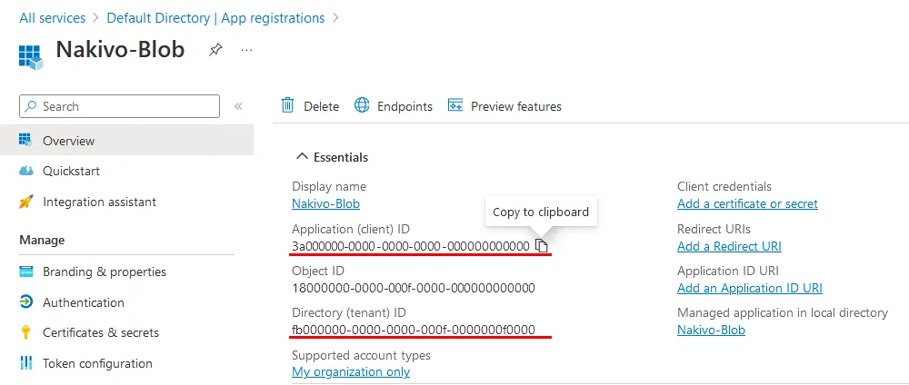 - Find the name of the application you registered earlier. In our case, we click the application name Nakivo-Blob to see more information.
