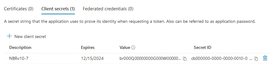 - A secret has been generated and added to the list of client secrets. Copy the value and secret ID to a safe location. Here are our values (yours will be different):