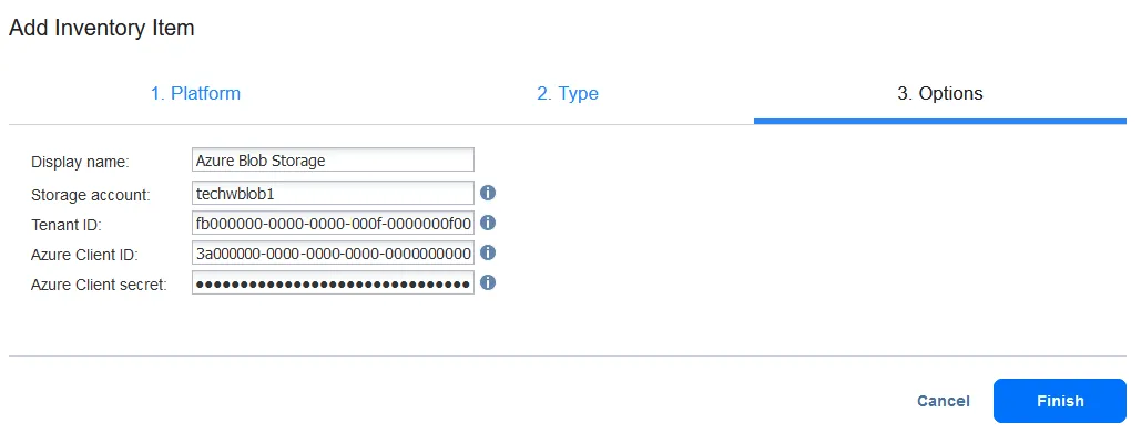 - Options. Enter the required parameters to add Azure Blob Storage.