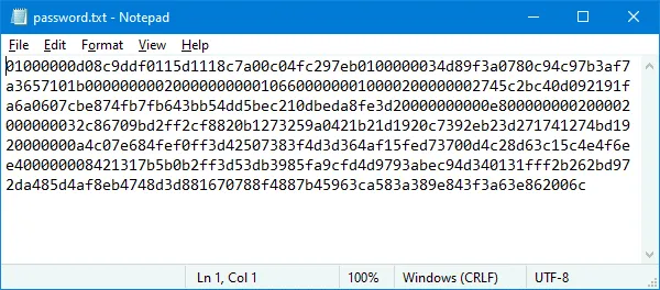 Then the password is saved in the encrypted form in the text file. If somebody sees the content of this file, the password is not displayed as plain text.