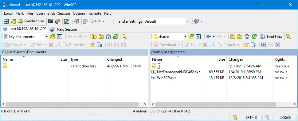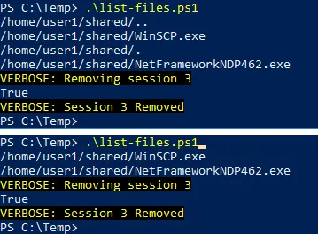 SFTP connection works in my case. We have copied two files to the shared folder (the location of the files is /home/user1/shared/ on the remote Linux machine). Let’s look at how to connect to the shared folder from Windows and how to use SFTP with Posh-SSH in PowerShell.
