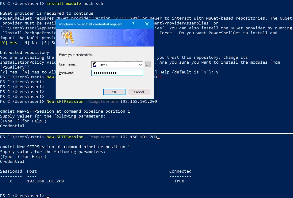 The authentication window is displayed after running the command. Enter a username and password to access the remote Linux machine with the files you need to access via SFTP. If you have entered the correct credentials, you should see the PowerShell output with the information about the SFTP session number, IP address of the remote host, and connection status. Once a session is created, an index number is assigned to the session.