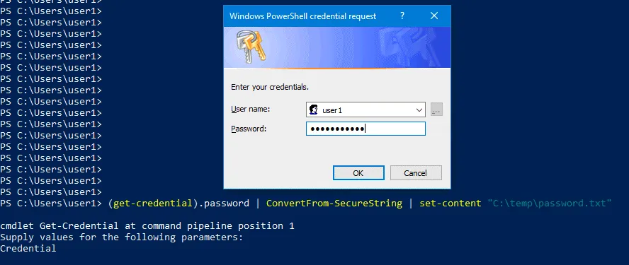 When you need to enter the password, define the file with a saved encrypted password (C:\temp\password.txt in our case).