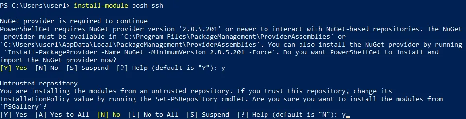 An Internet connection is required to install Posh-SSH with the above commands. In my case, I have installed the Posh-SSH module in PowerShell and can move to the next configuration steps.
