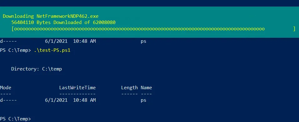 The NetFrameworkNDP462.exe file should be copied from /home/user1/shared/ (on a remote Linux machine) to C:\temp\ps\ (on a local Windows machine). As you can see on the screenshot below, the file is copied successfully in my case.
