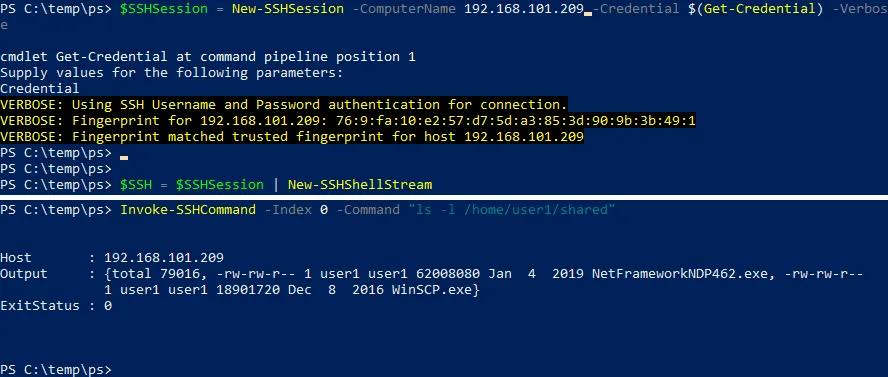 Invoke-SSHCommand -Index 0 -Command "ls -l /home/user1/shared"