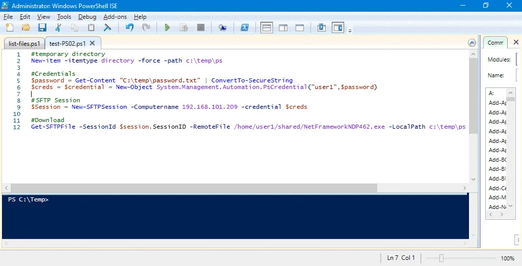 Let’s create a test script to explore the basic operations that you can perform in PowerShell when working with SFTP resources. This is not an SFTP script, this is a PowerShell script to work with SFTP. This test script should copy the .NET Framework installer file from a remote Linux machine to a local Windows machine.