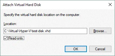 In the pop-up window, define the path to your VHD or VHDX file. Tick the Read-only checkbox if you don’t want to write data to the virtual disk. This option also protects data stored on the virtual disk against accidental corruption.
