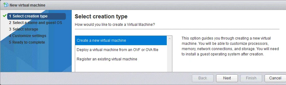 1. Select creation type. Hit Create a new virtual machine. Click Next on each step to continue.