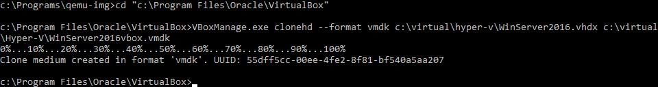 VBoxManage clonehd --format vmdk C:\virtual\Hyper-V\WinServer2016.vhdx С:\virtual\Hyper-V\WinServer2016vbox.vmdk