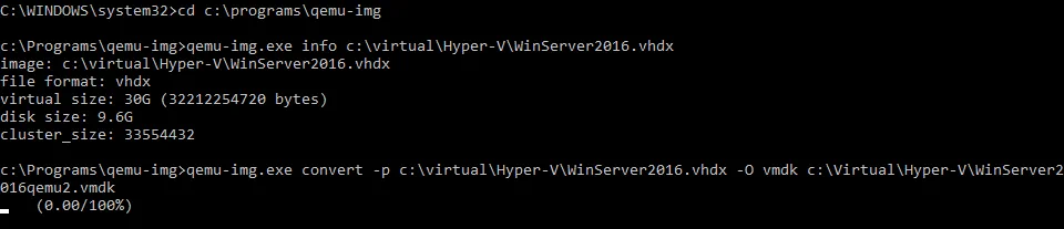 qemu-img.exe convert -p c:\Virtual\Hyper-V\test-disk.vhd -O vmdk c:\Virtual\Hyper-V\test-disk.vmdk
