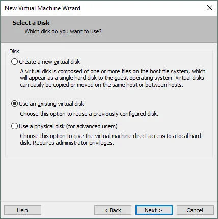 Select “Use an existing virtual disk” at the Select a Disk step.