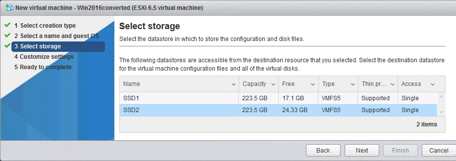 3. Select storage. Select the datastore in which to store the VM files. The name of the datastore used in this example is SSD2.
