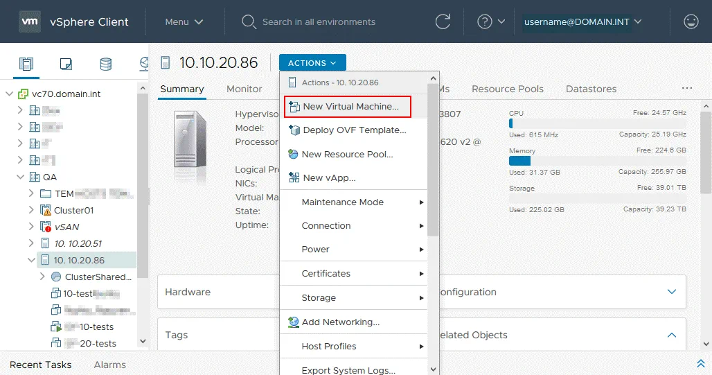 Once you have logged in to vCenter 7, click Hosts and Clusters, select your data center, and click the ESXi host on which you want to create a new virtual machine. In our case, we are going to create a VM on the ESXi 7 host with IP address 10.10.20.86. After selecting the ESXi host, make sure that there are enough free resources available, such as CPU, memory, and storage capacity. Click Actions > New virtual machine to start creating a new VM on the selected ESXi host by using VMware vSphere Client.