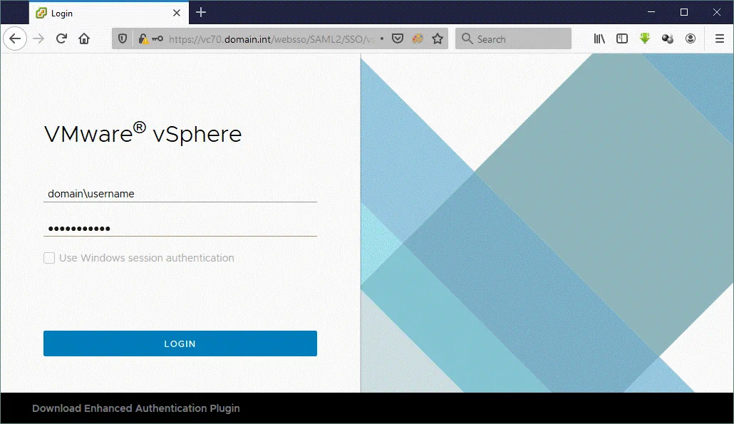 Enter your user name in the domain\username format and then enter your password. You can use an administrative account or another account that has enough permissions to create virtual machines in vCenter. Click Login.