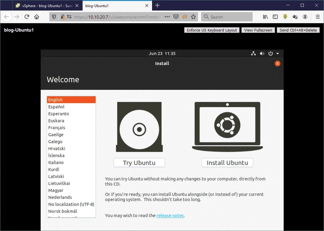 In this example we use the Web Console in the web browser (see the screenshot below). After creating a new VM, starting the VM and booting from the installation media you should install an operating system. Ubuntu 19 x64 is installed in this example. The installation process is the usual for Ubuntu Linux operating systems so I won’t go into the details of Ubuntu installation in this article.