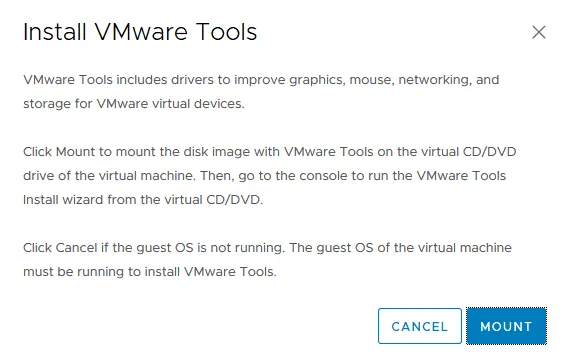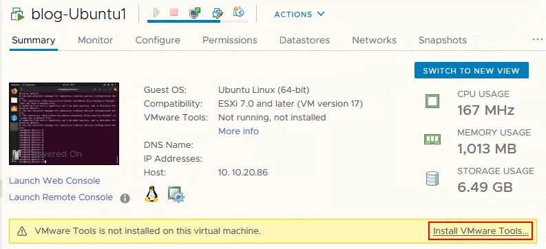 You can see a warning message in the web interface of VMware vSphere Client that VMware Tools are not installed on this virtual machine. If you click Install VMware Tools on this page, a virtual ISO disk that contains the VMware Tools installer will be mounted to the VM.