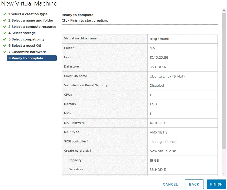 8. Ready to complete. Check configuration for your new VM and hit Finish to create the new VM. If you forgot to configure some settings, go back and edit the needed settings.