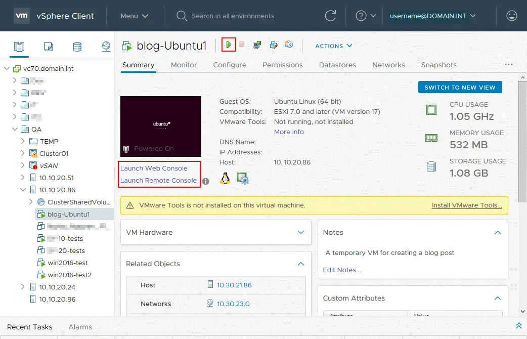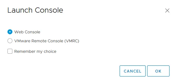 Click Launch Web Console to open the Web Console in a new tab of your web browser by using VMware vSphere Client. As an alternative, you can install VMware Remote Console (VMRC) that is a standalone application used to connect to a virtual machine display and manage the VM by using input devices such as keyboard and mouse. You can download VMware Remote Console from the VMware website. It is also possible to use VMware Workstation for connecting to a VM and VM management instead of using the Web Console or VMware Remote Console. If VMware Workstation or VMware Remote Console is installed, clicking Launch Remote Console will initiate starting the appropriate application. If both applications are installed, you are able to select which one to run for connecting to a VM for management.