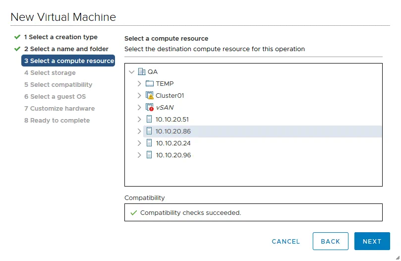 3. Select a compute resource. Select the ESXi host to run a new virtual machine. As we want to create a new VM on the ESXi host with IP address 10.10.20.86, we select this host in the list. Compatibility checks succeeded means that everything is correct and you can continue.