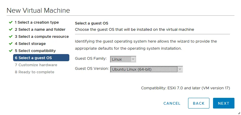 6. Select a guest OS. Select a guest OS family and then select a guest OS version. In this example, Ubuntu Linux 19 x64 is installed.