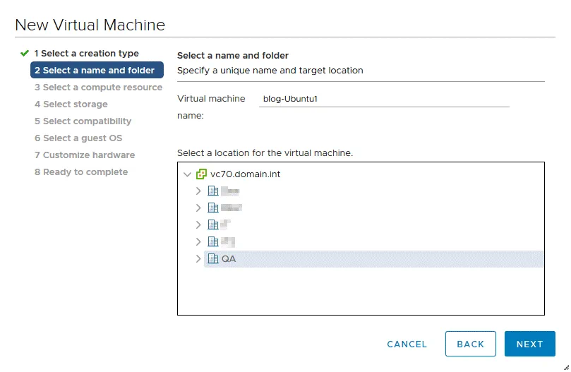 2. Select a name and folder. Enter a name for the new virtual machine. As we are going to install Ubuntu Linux on the new VM, the name of the VM used in this example is blog-Ubuntu1. Then select a location for the virtual machine. We will store the new VM in the QA data center.