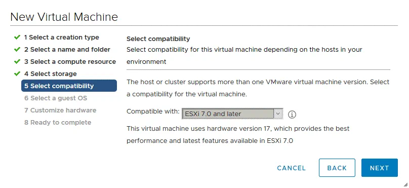 5. Select compatibility. Select compatibility for this virtual machine depending on the ESXi hosts used in your environment. VMware vCenter 7.0 can be configured to manage ESXi 7.0, ESXi 6.7 and ESXi 6.5 hosts. The ESXi compatibility level defines the virtual machine hardware version. The ESXi 7.0 compatibility level is used for the VM hardware version 17 and supports all vSphere 7 features.
